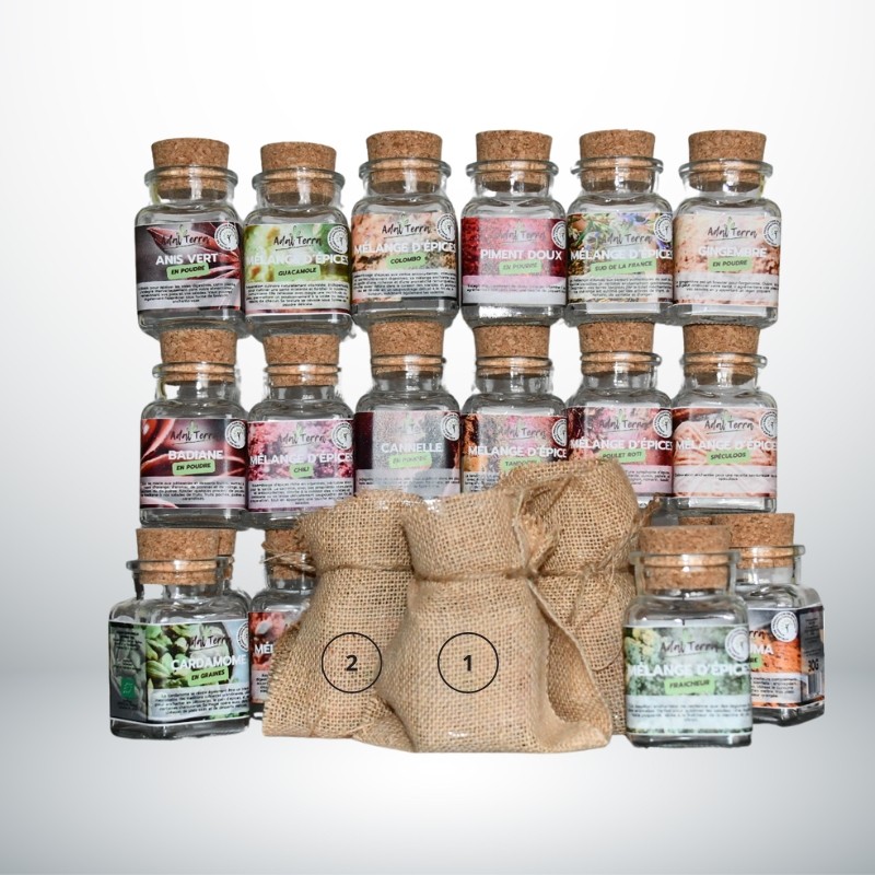 Poivre noir*, Badiane*, Anis vert*, Paprika doux*, Ail des ours*, Citronnelle*, Cannelle*, Piment de Jamaique*, Origan*, Romarin*, Sariette*, Gingembre*, Curcama*2, Ortie*, Cumin*, Coriandre*, Ail*, Laurier*, Muscade*, Graines de fenugrec*, Graines de moutarde*, Menthe douce*, Citron* et Fenouil*